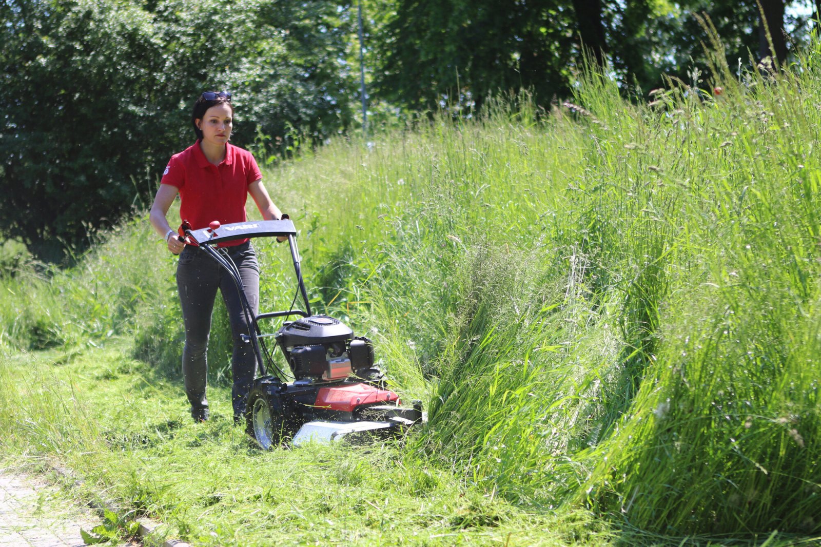 a šíří záběru 58 cm si perfektně poradí s vysokou trávou, bez problému ji rozdrtí a zanechá minimální travní zbytek, a to díky patentovanému tvaru žacího prostoru v kombinaci s  odolným značkovým mulčovacím nožem zn. GATOR. Dalším chráněným prvkem je vysoce funkční vodicí ostruha, která perfektně vede stroj i v tom nejnáročnějším terénu. Zároveň umožnuje výškové nastavení žacího prostoru od 4 do 9 cm v 16 polohách.