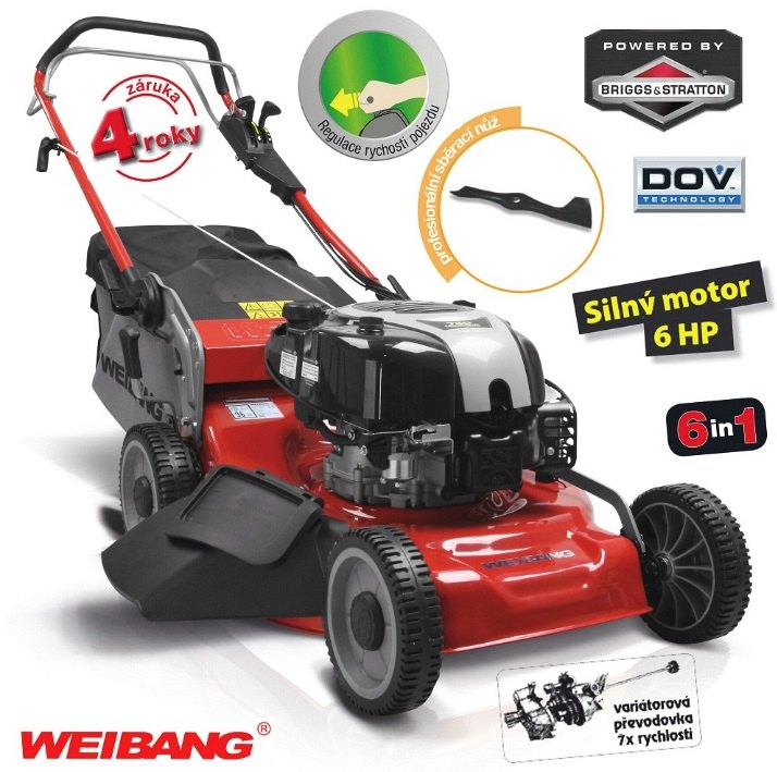Sekačka WEIBANG WB 506 SBV 6in1 vyniká speciálním pevným a masivním ocelovým šasim. Velkou předností této sekačky je variabilnost použití funkcí 6 in 1, což znamená, že sekačka WEIBANG WB 506 SBV 6in1 umí sbírat posečenou trávu do koše, mulčuje, vyhazuje trávu bokem, zadním deflektorem a má variabilní pojezd daný 3 rychlostní variátorovou převodovkou. Výhoda silného motoru o výkonu 6 HP a nože s velkými lopatami Vám perfektně sebere i přerostlou mokrou trávu. Pogumovaná sendvičová kola jsou uložena v oboustranných kuličkových ložiscích, centrální nastavení výšky sečení je u této značky samozřejmostí. Velkým nadstandardem u této sekačky je použita speciální třecí spojka na noži sekačky pod unášečem, která je schopna prokluzu nože při naražení do pevné překážky.