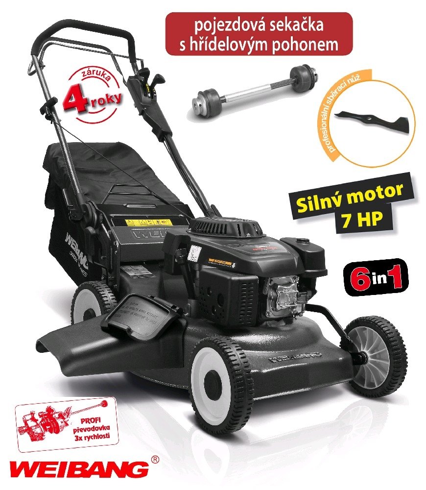 Benzínová sekačka s profesionální 3 st. převodovkou Weibang WB 537 SCV 6IN1 je vybavena motorem WEIBANG o výkonu 7 HP, šířkou sečení 53 cm a košem o objemu 70 l.