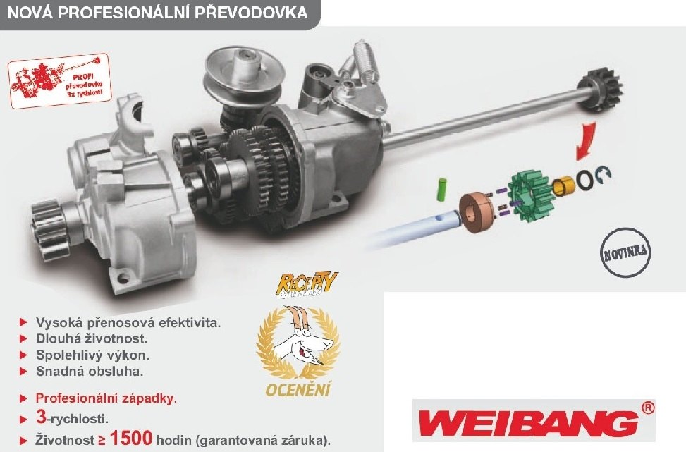 Velkou výhodou této sekačky WEIBANG WB 537 SCV 6in1 je řešení pojezdu za pomocí hřídelového kardanového pohonu. Jedná se o unikátní bezztrátovou technologii pojezdu, bez použití klínového řemene. Tímto odpadají problémy s klínovým řemen, čištění spodní části sekačky atd. Hřídelový kardanový pohon je bezúdržbový s podstatně delší životností. V neposlední řadě nutno upozornit na profesionální prvek, kterým sekačka disponuje je masivní kovová 3-rychlostní profesionální převodovka s garantovanou dlouhou životností až 1500 hod.