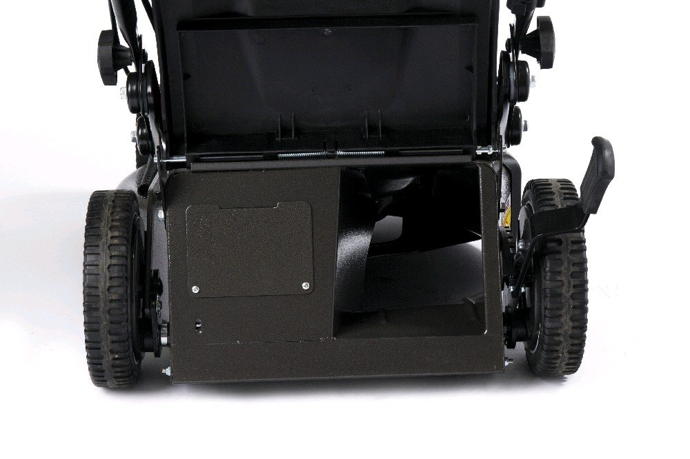 Novinkou sekačky je funkce tzv. "CHYTRÉ ŘEŠENÍ", sekačku lze pro ekonomické uskladnění, snadné čištění, servisování otočit a postavit na zadní speciální patky šasí, tímto se snadno dostanete na spodní část žacího ústrojí, uložení náprav a převodovku. Ergonomicky upravená madla se dají variabilně nastavit do jakékoli výšky za pomocí profesionálních masivních celokovových rychloupínáků.