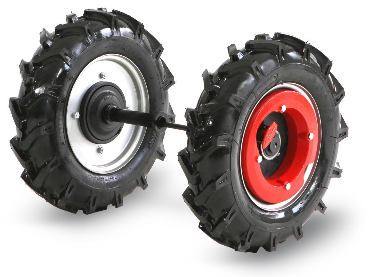 Kola mají pneumatiky s traktorovým šípovým vzorem na plechových ráfcích a jsou přišroubována čtyřmi šrouby na volnoběžný náboj. Kola jsou osazena sadou vnějších závaží. Vnitřní závaží lze dokoupit. Tažná náprava se k převodové skříni připojuje nasazením poloos na výstupní hřídel převodové skříně a zajišťuje se stažením ke skříni pomocí dlouhého osového čepu skrz poloosy a skříň. Po výměně tažné nápravy za kypřicí ústrojí vznikne profesionální rotavátor o záběru až 115 cm.