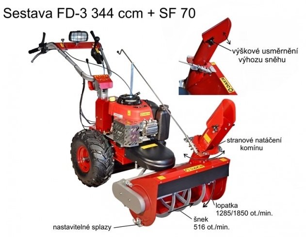 Kombinace pohonné jednotky FD-3 a frézy na sníh SF 70 je vhodná i do skutečně náročných podmínek, kde je potřeba odhazovat sníh přes vysoké bariéry, či do větších vzdáleností. Díky silnému motoru zvládá tato fréza odhazovat až 30-ti centimetrovou vrstvu právě napadlého sněhu. Jedná se o dvoustupňovou frézu na sníh s pomaloběžným šnekem a rychloběžnou lopatkou v jedné ose. Unikátnost našeho řešení nabízí možnost nastavení dvojích otáček vyhazovací lopatky této sněhové frézy. Pro lehký prašan nastavíte rychlejší otáčky lopatky (1850 ot/min) a tím zvýšíte délku odhozu, naopak při nastavení nižších otáček (1285 ot/min) zefektivníte odhoz těžkého mokrého sněhu. Vyletující sníh lze odhazovat prakticky kamkoliv před nebo vedle stroje díky natáčecímu komínku. Stroj má diferenciál s uzávěrkou, je vybaven světlometem, elektrickým startérem s 12 V baterií. Hydrostatická převodovka Tuff Torq umožňuje plynulé nastavení rychlosti pojezdu, tzn. že při frézování sněhu můžete jet s plným výkonem motoru libovolně (nízkou) rychlostí = vždy přesně dle aktuálních podmínek. A pokud potřebujete vycouvat, nastavíte si opět plynule libovolnou rychlost pojezdu zpátečky. Stroj je vhodné doplnit o sněhové řetězy, které jsou vyrobeny z kalené oceli a nabízíme je pod objednacím číslem 10100.082. Špičkové parametry této sněhové frézy vytvářejí ideální nástroj pro údržbu rozlehlých ploch, který je vhodný i pro komunální služby. Stavebnicové řešení pak poskytne spoustu dalšího využití, například jako zametací kartáč, sekačka, mulčovač, vozík, rozmetadlo soli atd.
