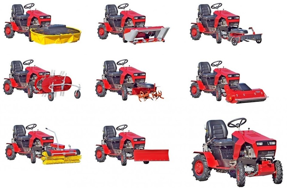 Motor o výkonu 15,5 Hp, hydrostatická převodovka, zvedání nástavců z místa obsluhy, možnost bohatého příslušenství.