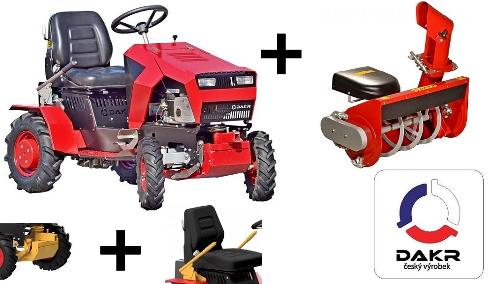 Motor o výkonu 15,5 Hp, hydrostatická převodovka, zvedání nástavců z místa obsluhy, možnost bohatého příslušenství.