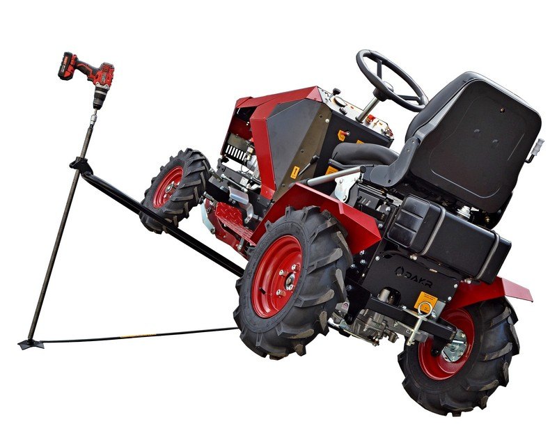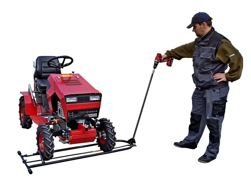 Tímto typem zvedáku se zahradní traktor nakloní na stranu. Zdvihání zajišťuje vysokopevnostní šroub a matice. Místo kliky lze použít utahovačku, popřípadě akuvrtačku. Boční strana traktoru je vyzdvižena do výše 75 cm.