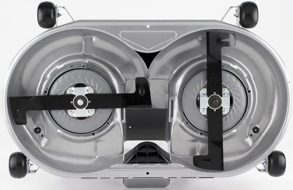 Pro žací ústrojí o šíři záběru 102 cm a více se u mezinápravových sekacích zařízení u traktorů Honda používá výhradně synchronizované uspořádání dvou žacích nožů. Tak aby nože vzájemně pokryly celkový záběr, je nutné, aby jejich délka v součtu byla větší než záběr. Díky překrývání rotačních výsečí je zaručeno perfektní pokrytí celé travní plochy bez možnosti vynechání neposekaných míst. Jak ovšem zajistit, aby se při vzájemném otáčení v jedné rovině nedostaly do vzájemného kontaktu? Spolehlivé a bezpečné časování rotace jednotlivých nožů o 90° vůči sobě je zajištěno ozubeným řemenem. Nehrozí tak nebezpečí kolize sekacích nožů a případná destrukce. Navíc je mnohem lépe optimalizován průtok vzduchu do sběrného boxu a lepší sběrací schopnost traktoru.