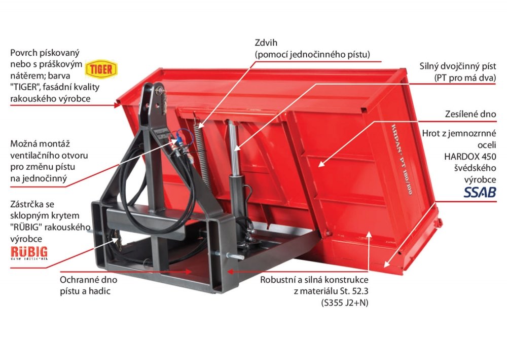 Hydraulicky ovládaná traktorová plošina KRPAN PT 100 dlouhá 100cm najde uplatnění v lesnictví, zemědělství, zahradnictví nebo i stavebnictví. Je vhodná pro nakládání a převoz sypkých i kusových materiálů. Ideální pro manipulaci v malých či jinak ztížených prostorech. Plošina je vybavena silným dvojčinným pístem. V případě že traktor není vybaven dvojčinným systémem, lze píst jednoduše upravit na jednočinný píst. Výšku plošiny lze navýšit přídavnými bočnicemi.